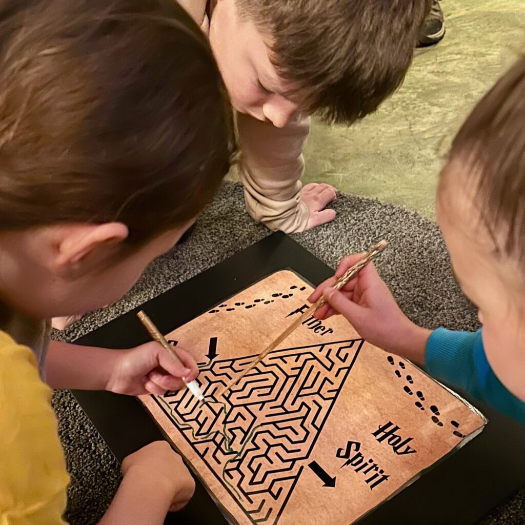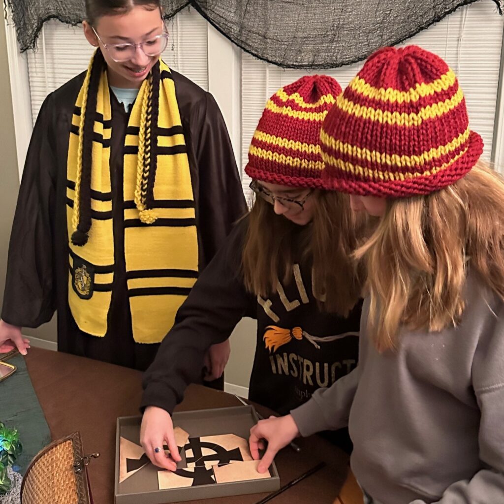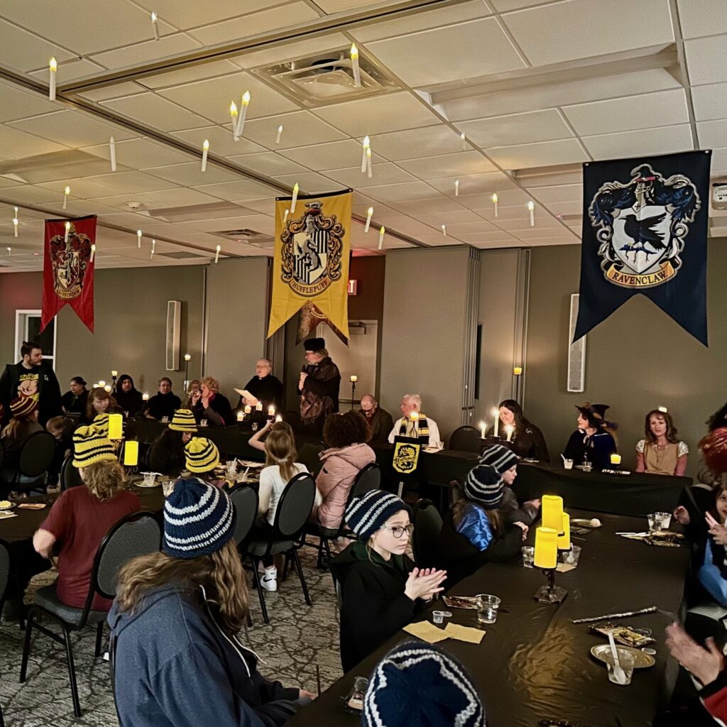 The Gospel at Hogwarts children’s ministry event was born in 2016 from some energetic and faith-filled lay leaders, who are also super fans of anything Harry Potter. Each year, most of Holy Family Episcopal Church, Fishers is transformed into Hogwarts, the School of Discipleship.  Children are sorted into houses and spend the evening attending classes such as potions, astronomy, and exploratory studies. The children’s lessons are centered around specific scripture readings, often Gospel passages. The class professors read the Bible stories, and children discuss the meaning and any connections they can make to their own lives. For example, in Herbology, while children plant Mandrakes (a magical and quite noisy plant), they hear the story about the farmer sowing seeds on good soil and rocky ground. The parables, words, and action of Jesus are the focus of each class and are experienced in a fun and interactive environment. The lessons are careful to never associate Jesus with magic itself.